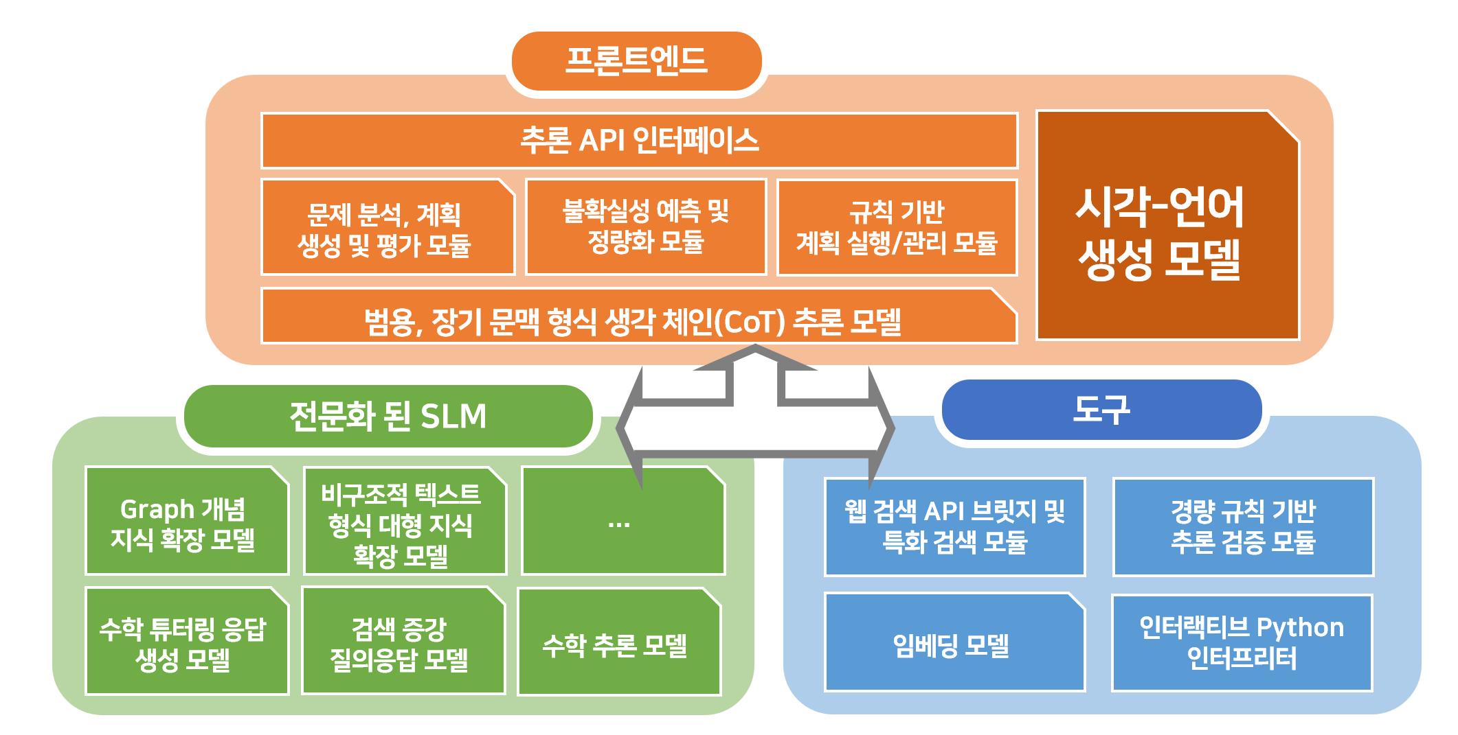 - ETRI 언어지능연구실에서는 ‘사람처럼 개념적으로 이해/추론이 가능한 복합인공지능 원천기술 연구’ 개발 과제를 통해 언어지능을 포함한 수리-논리 지능, 시공간 지능 등이 결합된 복합지능 기술 개발을 추진하고 있으며, 이를 위한 기반이 되는 파운데이션 모델 EAGLE(ETRI Advanced Generative Language Engine)을 개발, 공개하고 있음 - 이를 바탕으로 수학 추론 및 수학 AI 튜터링을 위한 복합지능 대화 시스템을 개발하고 있으며, 해당 기술을 확장하여 멀티모달 콘텐츠 기반 수학 AI 튜터 서비스를 실증 예정 |