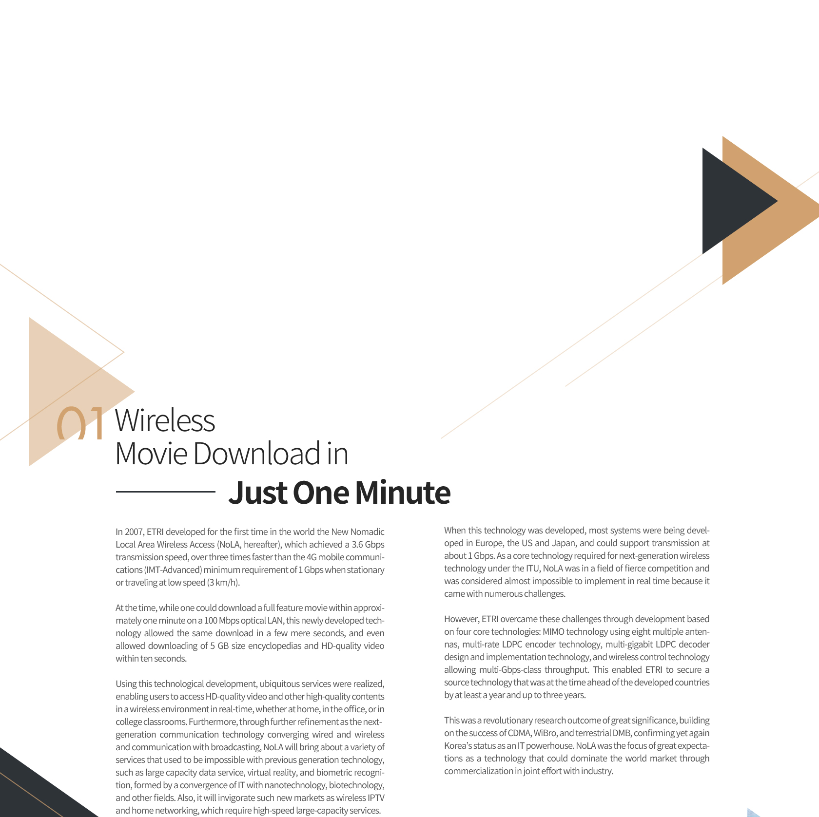 In 2007, ETRI developed for the first time in the world the New Nomadic Local Area Wireless Access (NoLA, hereafter), which achieved a 3.6 Gbps transmission speed, over three times faster than the 4G mobile communications (IMT-Advanced) minimum requirement of 1 Gbps when stationary or traveling at low speed (3 km/h).
