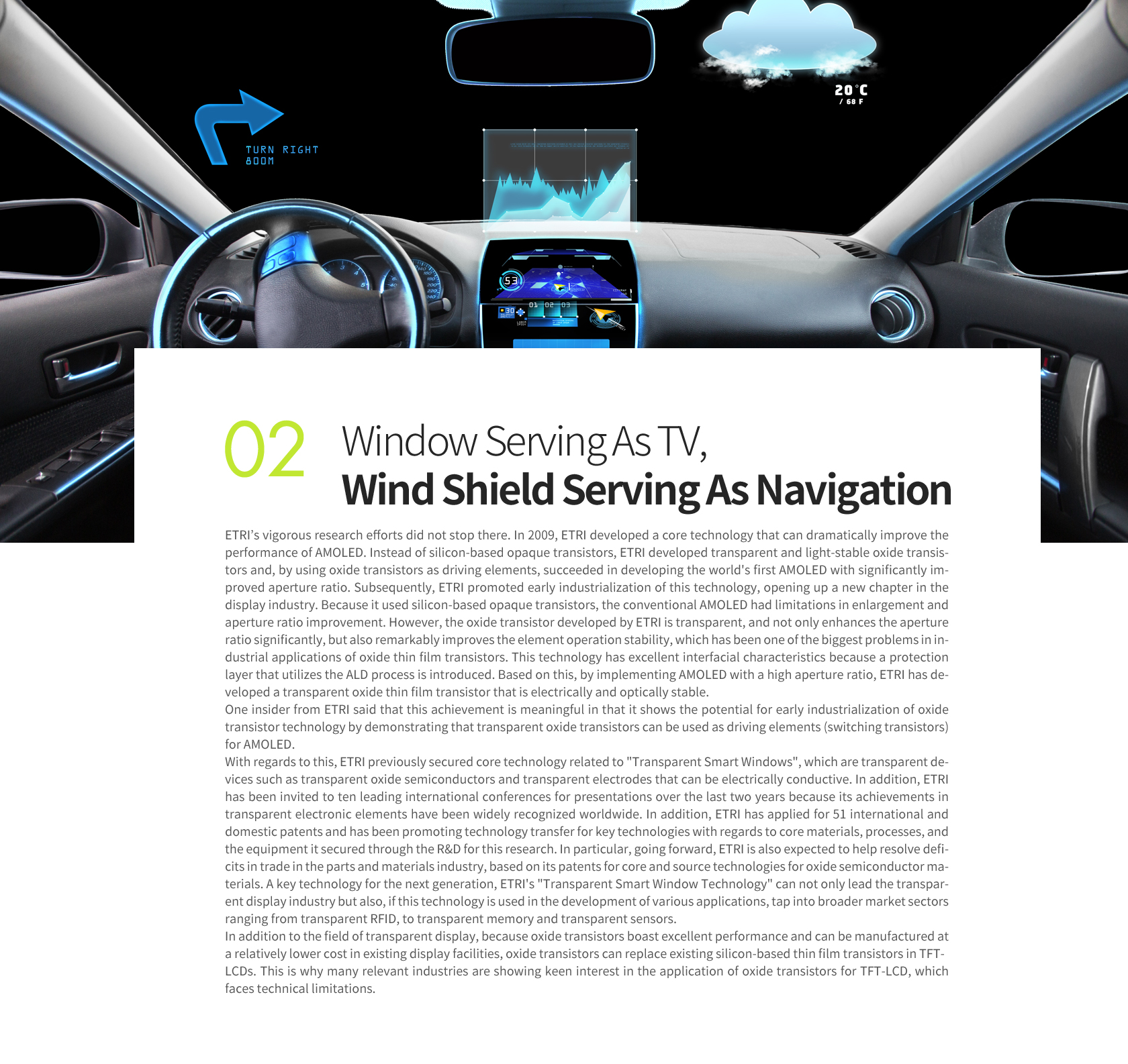 A key technology for the next generation, ETRI's "Transparent Smart Window Technology" can not only lead the transparent display industry but also, if this technology is used in the development of various applications, tap into broader market sectors ranging from transparent RFID, to transparent memory and transparent sensors.