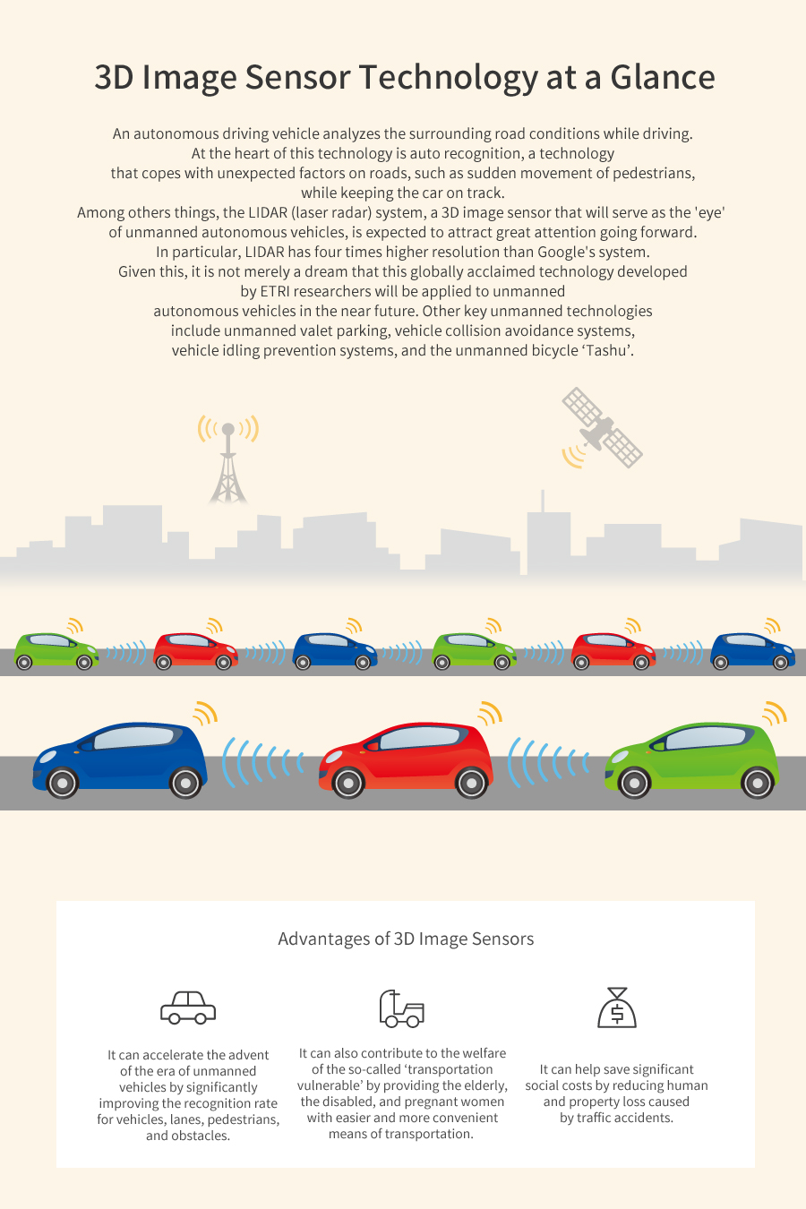 In 2012, using purely homegrown technology, ETRI successfully developed the 'Real-time 3D integrated laser radar image sensor'. This technique is a STUD method based on a unitary large area detector, with the receiver remaining stationary, which is different from the conventional method of employing a detector array or a rotation-based 3D imaging technique. This method is suitable for securing long distance 3D images at high resolution and in real-time. At the end of 2016, ETRI also developed a flash-type 3D image sensor chip with a 32x32 pixel array; this was for only the second time in the world. At the present time, using state-of-the-art functions such as pedestrian safety protection and assistant driving function as technological barriers, automakers in Europe are trying to protect their markets from foreign car makers. In addition, Google, though it is not a commercial automaker, is preparing for the era of completely autonomous vehicles for the elderly and disabled population, using its highly advanced information technology. In this global context, the STUD and flash laser radar developed by ETRI are expected to be a stepping stone to protect the domestic automobile market from competitors and to contribute to maintaining and expanding our dominance in global technological competition in various industries.