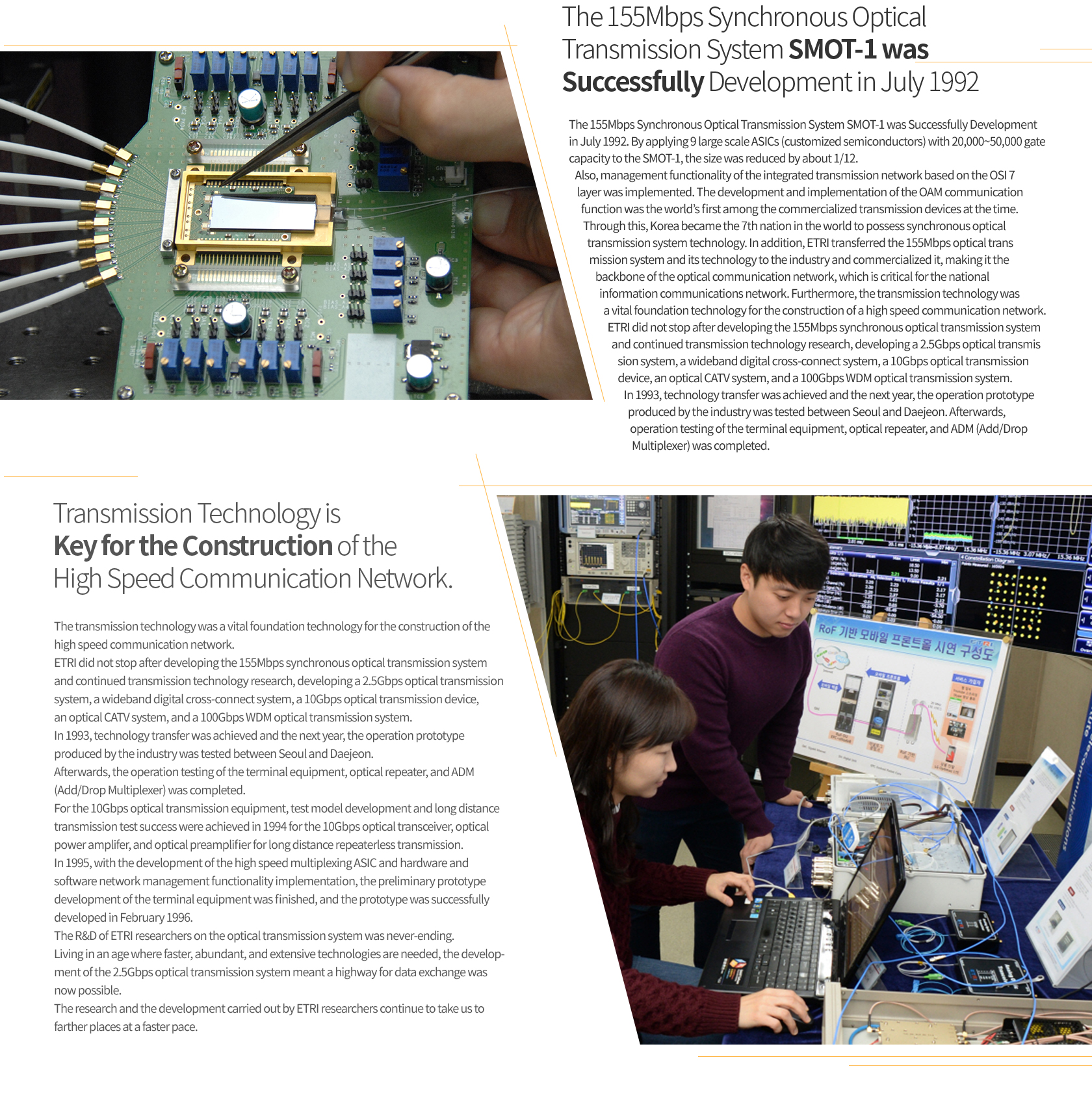 The transmission technology was a vital foundation technology for the construction of the high speed communication network. ETRI did not stop after developing the 155Mbps synchronous optical transmission system and continued transmission technology research, developing a 2.5Gbps optical transmission system, a wideband digital cross-connect system, a 10Gbps optical transmission device, an optical CATV system, and a 100Gbps WDM optical transmission system. In 1993, technology transfer was achieved and the next year, the operation prototype produced by the industry was tested between Seoul and Daejeon. Afterwards, the operation testing of the terminal equipment, optical repeater, and ADM (Add/Drop Multiplexer) was completed.