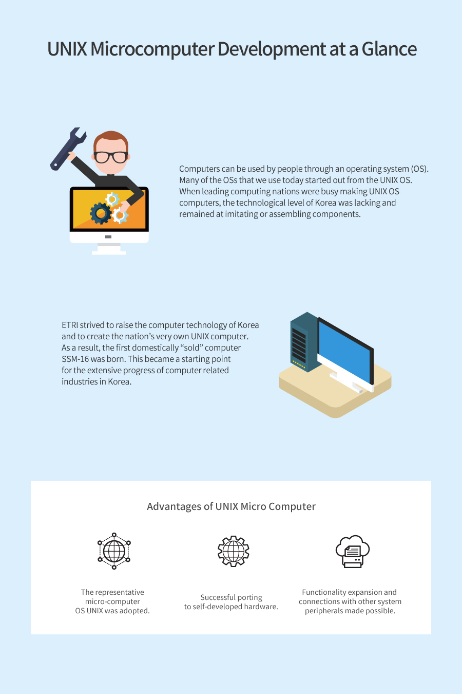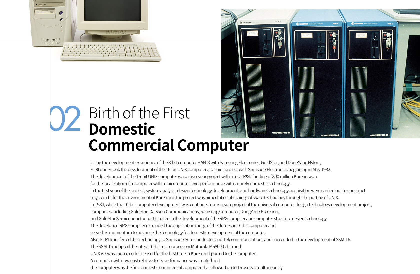 Development of the UNIX computer was a company led research project by ETRI and Samsung Electronics, and the research project was successful in designing the entire microcomputer system and localizing the major computing components. Also, the first domestic commercial computer SSM-16 was created, which became a critical steppingstone in the computer development history of Korea.