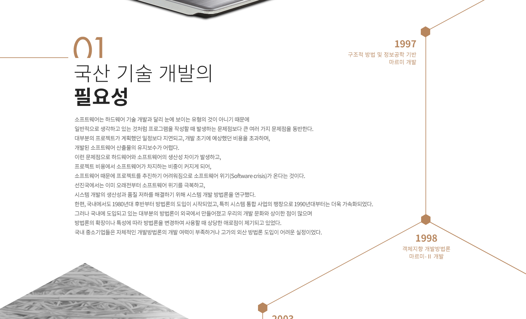 소프트웨어 재사용, 적시성, 유지보수 등이 중요시되면서, 작은 단위의 부품을 조립하여 제품을 만들어내는 일반적인 산업의 개념을 소프트웨어에 도입하여 생산성을 향상시키고자 하는 움직임이 활발하게 진행되었다. ETRI에서는 이러한 흐름에 발맞춰 객체보다 확장된 개념으로 지속 데이터와 공용 오퍼레이션을 가지고 캡슐화 되어 있다는 점에서 객체와 유사하나 보다 큰 서비스의 집합으로 응집도가 높고 결합도는 낮은 객체의 그룹이라고 할 수 있는 컴포넌트 기반 시스템 개발 방법론인 마르미-III를 개발했다.