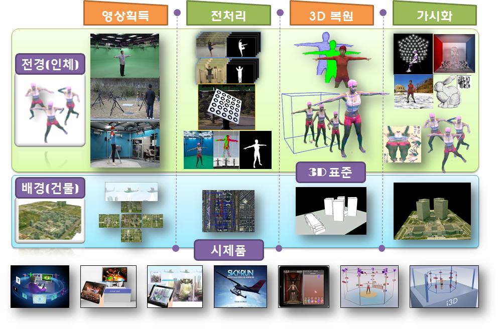 자연조명 환경에서 상호작용하는 동적 다개체 및 건물을 대상으로 ▲ Full 3D 외형 및 모션 정보를 객체기반으로 동시 복원하기 위한 핵심 원천기술 개발 ▲ 방통융합형 인터랙티브 3D 콘텐츠 서비스를 위한 시범서비스 플랫폼 개발 ▲ 대용량 데이터로 구성된 3D 콘텐츠 파일 포맷, 전송 및 사용자 인터랙션을 위한 표준화를 목적으로 함.