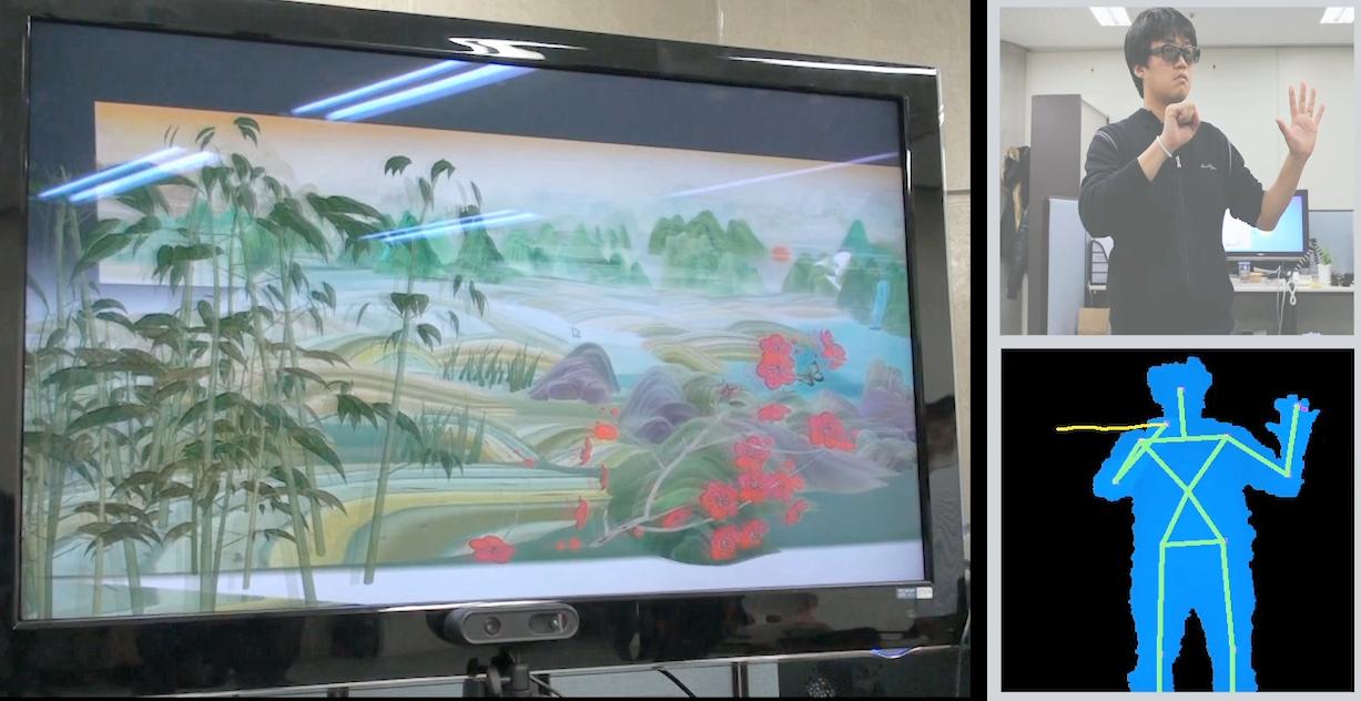 ‘입체 상호작용’[참고자료 3-4]에서는 4계절의 입체로 보여 지는 동양화 풍의 배경내의 콘텐츠와 사용자가 상호작용 해 볼 수 있는 디지털병풍과 사진앨범을 사용자의 제스처를 이용하여 직접 내비게이션 해 볼 수 있는 포토앨범을 전시한다.