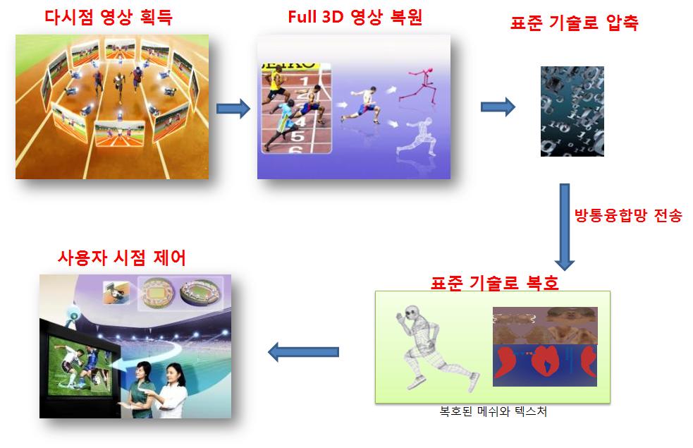 차세대 리얼 3D 원천기술은 다시점 영상을 이용하여 실물과 동일한 외형과 모션을 동시에 복원하는 ‘Full 3D 복원기술’[참고자료 1], 적외선 카메라를 통하여 움직이는 사람의 동작을 인식하고 3D 콘텐츠와 상호작용이 가능한 인터페이스를 제공하는 ‘체감형 입체 3D 상호작용 기술’[참고자료 2], 3D 콘텐츠의 전송 디코딩 시간을 0에 가깝게 복원하는 압축 기술인 ‘3D 콘텐츠 제작/인식, 전송, 상호작용의 종합 솔루션 기술’로 구성된다.