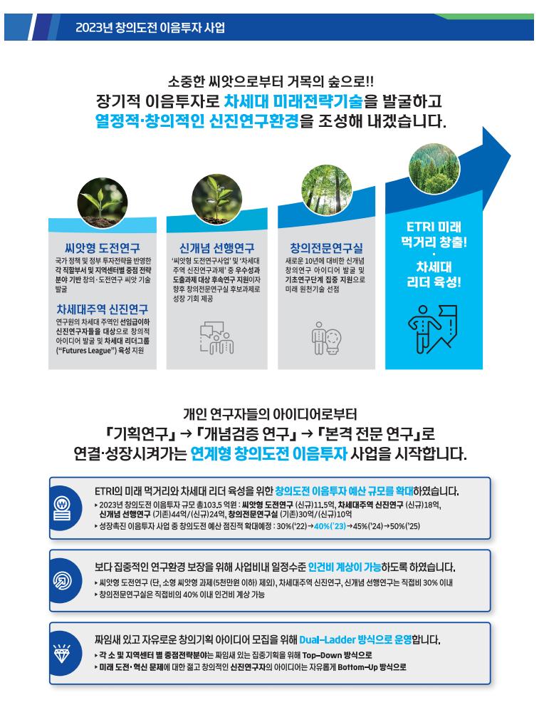 한국전자통신연구원(ETRI)이 젊고 창의적인 아이디어를 적극 발굴하고 국가 미래 기술을 책임질 차세대 리더그룹을 육성하자는 취지로 2023년 차세대주역 신진연구 사업을 추진한다고 밝혔다.