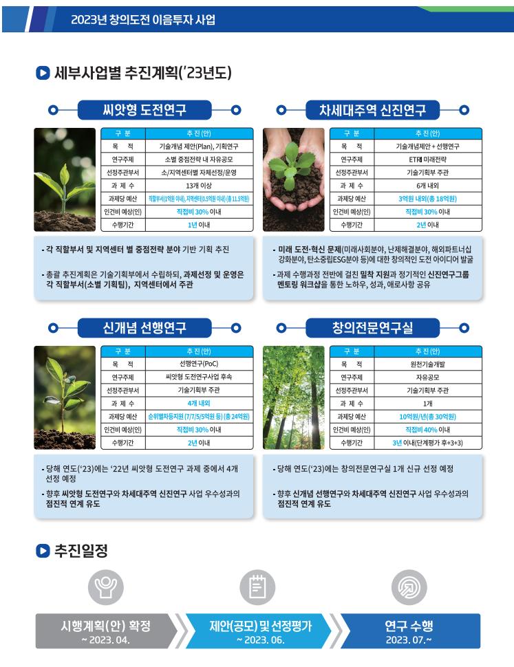 본 사업은 개인 연구자들의 아이디어로부터 시작해 과제 기획연구, 개념검증연구, 본격적인 전문연구로 연결·성장시키는 것을 목표로 하는 ‘ETRI 연계형 창의도전 이음투자’사업의 일환으로 연구원에서 처음 시도하는 사업이다.