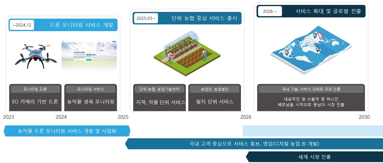 농작물 드론 모니터링 서비스 사업화 계획 공유(더피치-ETRI 에어모빌리티연구본부) 농작물 드론 모니터링을 위한 서버 구축과 서비스 테스트베드 운용(공동사업화랩에 구축)을 통한 시범 서비스 타당성 검증 홍보, 마케팅에 공동사업화랩 적극 활용(고객사 견학을 통한 사업 추진) - 2023.08 ∼ 2024.12 : 드론모니터링 서비스 개발 - 2025.03 ∼ : 농작물 드론 모니터링 서비스 출시 - 2026.01 ∼ : 동남아 시장 진출 국내 서비스 확대(산림, 화훼) 현지화 기술 개발 후 글로벌 진출 |