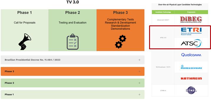 브라질 정부는 올해 8월, 대통령령을 통해 차세대 방송 표준DTV+를 국가 표준으로 확정했다. 이 표준에 ETRI가 개발한 ATSC 3.0 기반 다중 송수신 안테나(MIMO)계층분할다중화(LDM)를 결합한 전송기술이 반영되었다.