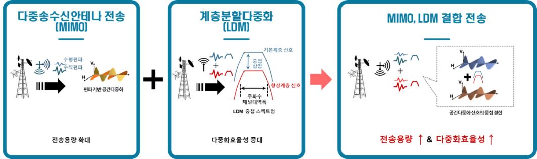 5) 계층분할다중화(LDM, Layered Division Multiplexing) : 하나의 주파수 대역에서 서로 다른 신호를 계층 구조로 중첩 전송하는 기술로, 고정 수신과 이동 수신을 동시에 지원해 주파수 효율을 극대화