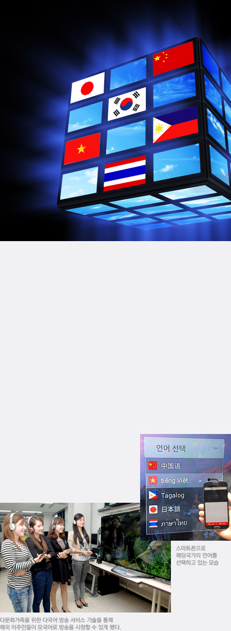 ETRI에서 개발한 ‘다국어 방송 서비스 기술’이 이러한 문제를 해결하는 데 큰 도움이 되고 있다. 본 기술은 스마트TV에서 다문화가족 구성원의 스마트폰을 통해 해당 국가 언어로 방송을 시청할 수 있는 기술로, 스마트TV 셋톱박스가 있으면 스마트폰으로 다국어방송용 애플리케이션을 깔아 사용할 수 있다.