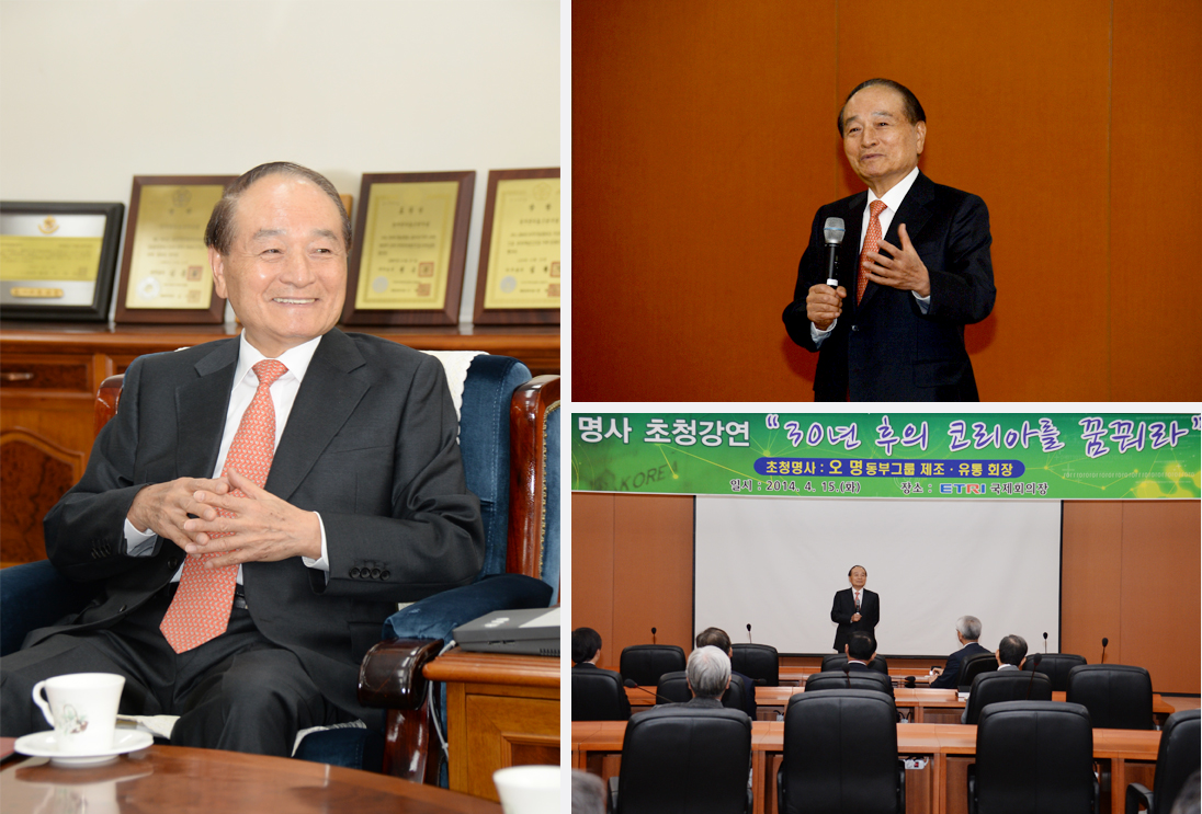 '통신혁명의 지휘자', 'IT혁명의 대부'로 잘 알려진 오명 전 과기부총리가 지난 4월 15일, ETRI 국제회의장에서 '30년 후의 코리아를 꿈꿔라'를 주제로 강연을 하고 있다.