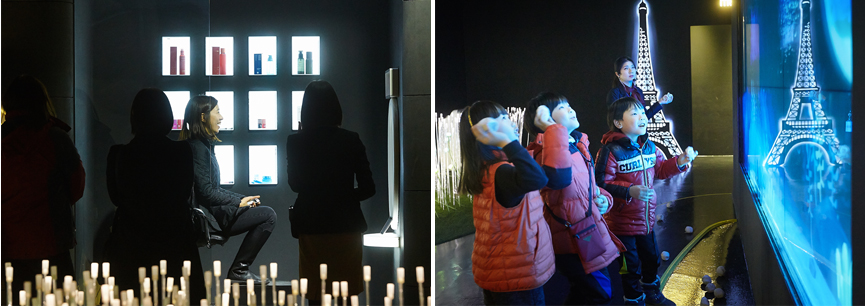탐구관 한 쪽에는 아이들의 발길을 쉽사리 떼놓지 못한 체험 공간이 있었는데, 바로 가상여행 공간이다. 모형 경기장에 자동차를 실시간으로 합성한 증강현실 기법으로 자동차 게임을 즐길 수 있다. 핸들과 페달을 조작해 직접 자동차를 운전하는 것이 즐거워 보였다. 증강현실은 다양한 분야에 활용되고 있는 IT 기술로 특히 소비자의 관심과 체험을 유도하는 광고 영역에서 진가를 발휘하고 있다. 탐구관 한쪽 바닥에는 센서카메라가 발그림자를 인식해 영상 반응이 일어나도록 하는 센서블 플로어가 있었다. 어느 한 곳 소홀하게 둔 곳 없이 ICT 기술을 체험해볼 수 있도록 한 것이 눈에 띈다.