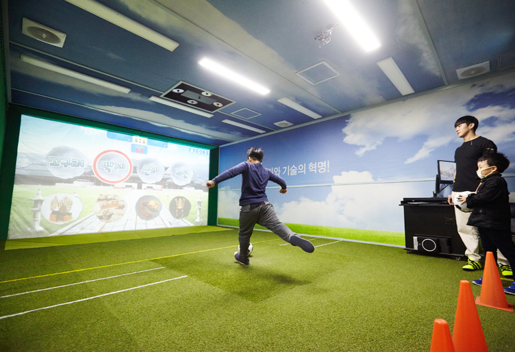 VR 스포츠실은 스포츠 통합플랫폼 기반의 융합교육을 강화하기 위해 맺은 서울시교육청-ETRI-옥수초등학교 간의 업무협약을 통해 개관하였습니다. 실내 스크린 상의 가상 목표물을 향해 공을 차거나 던져서 맞추는 체육 활동이죠. 단순히 공을 던지는 것에 그치는 것이 아니라 독도 퀴즈, 역사 퀴즈, 행성, 해양 등 다양한 교육 콘텐츠가 포함되어 있어 즐겁게 오락을 하면서 자연스럽게 지식을 습득할 수 있다는 장점이 있습니다. 특히, 미세먼지나 황사 등 환경 영향으로 운동장에서 체육 활동을 하기 어려웠던 상황에서 VR 스포츠실이 큰 도움이 되었습니다.