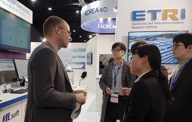 ETRI는 지난 2월 25일부터 나흘간 스페인 바르셀로나에서 열리는 세계 최대 규모 이동통신 산업 전시회인 ‘모바일월드콩그레스(MWC)’에 참가했다. ETRI는 이번 전시회에서 초연결통신, ICT소재부품, 지역산업IT융합 기술 등 총 4가지 최신 유망 ICT 기술을 선보였으며, 공동연구기관과 해외 마케팅도 추진했다.
