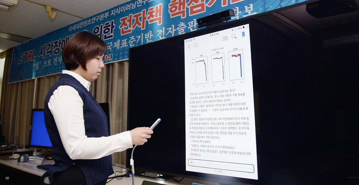 이로써 ETRI는 시각장애인에게 격차 없는 정보 접근권 및 학습권을 제공하기 위해 TTS를 통한 본문 읽기 기능 장애인 인터랙션에 기반한 전자책 뷰어 장애인 접근성 지원 차원에서 전자책을 손쉽게 저작하고 변환할 수 있는 저작도구 및 변환도구를 개발했다. 결국, 시각장애인들이 보다 편리하게 책에 접근할 수 있도록 전자책을 바탕으로 표준규약을 만들어 전체를 플랫폼화 한 셈이다.