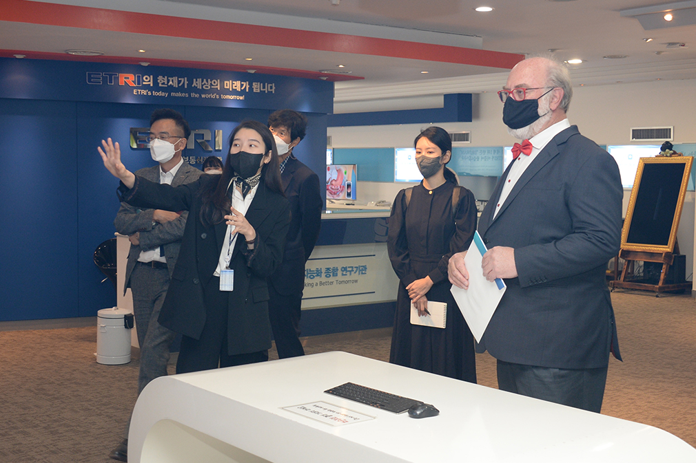 더불어, ETRI 정보통신체험관 투어를 통해 연구원이 개발한 홀로그램, 증강현실(AR), 디지털 초상화 등 최신 ICT 성과를 함께 공개했으며, ETRI 김명준 원장을 포함한 과학기술계 종사자들과 자유롭게 대화하는 시간을 가졌다.