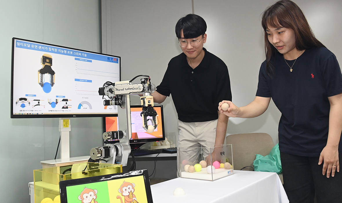 로봇 그리퍼(Gripper) 기술은 사람의 손처럼 감각을 느낄 수 있는 기능이 포함되어 지능적으로 물건을 구분해 잡을 수 있는 차세대 그리퍼 기술을 구현하는 것이 목표다. ETRI는 나노 복합소재와 나노 에어갭 구조를 적용해 압력과 벤딩을 선택적으로 감지하는 멀티모달 유연 센서를 개발하는 데 성공했다. 이를 로봇 그리퍼에 적용해 움켜쥐는 물건의 물성이나 형상 등 물리량을 매우 정확하게 구분할 수 있음을 시연했다. 이 그리퍼 기술은 의족이나 의수는 물론, 스마트팩토리, 스마트팜 등의 자동화 라인에서 사람을 대체하는 로봇 기술로 활용될 전망이다.
