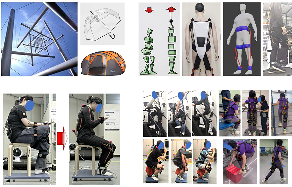 (From the top left, clockwise) Example of tensegrity structure / Elastic suit based on tensegrity structure / Posture change before and after wearing / Wearing effect analysis process
